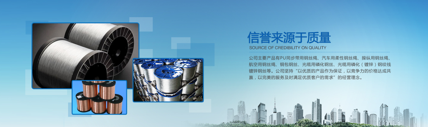 公司主要產(chǎn)品有PU同步帶用鋼絲繩、汽車用柔性鋼絲繩、操縱用鋼絲繩、航空用鋼絲繩、銅包鋼絲、光纜用磷化鋼絲、光纜用磷化(鍍鋅)鋼絞線、鍍鋅鋼絲等。經(jīng)過多年的研究、摸索、開發(fā),公司已形成了完整的技術(shù)、工藝軟件,產(chǎn)品實物質(zhì)量均達(dá)到國際先進水平。